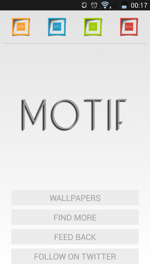 Motif 1.1.5 APK theme works well with Apex, Nova, ADW, and Go Launchers. It may work with other varying launchers found on the market but has not been tested for compatibility.